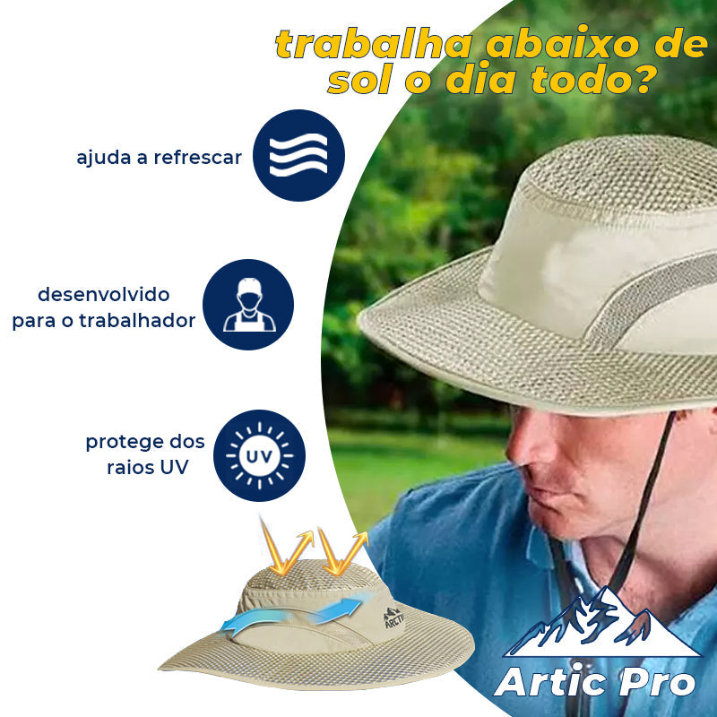 Desenvolvido com tecnologia militar americana, o chapéu Artic possui um moderno sistema interno de resfriamento evaporativo.