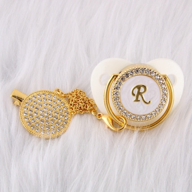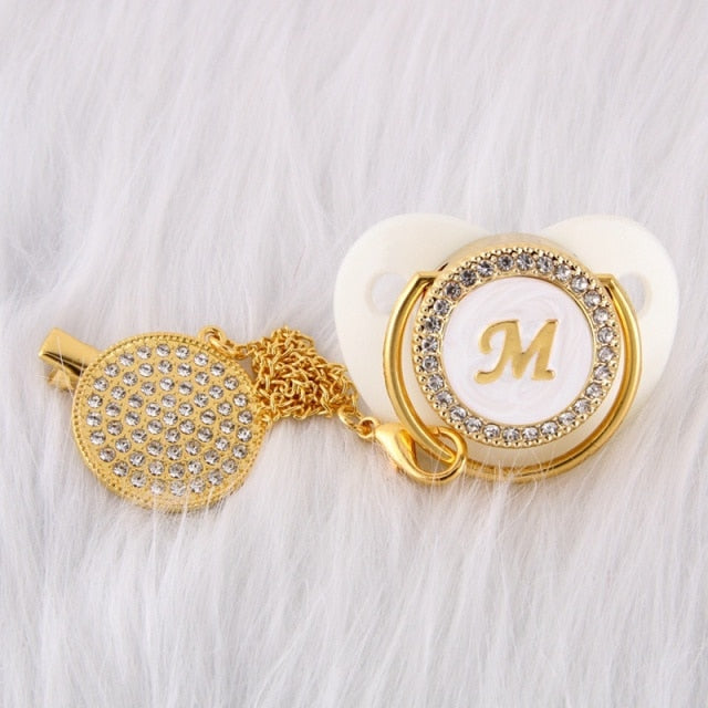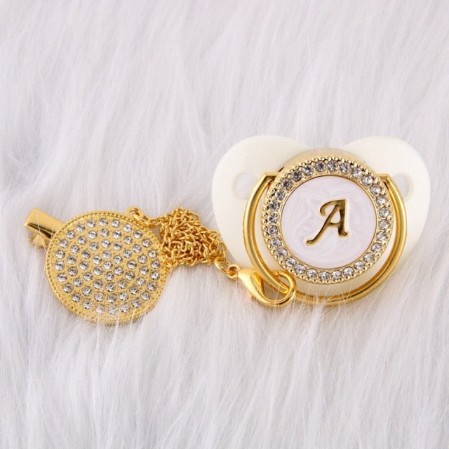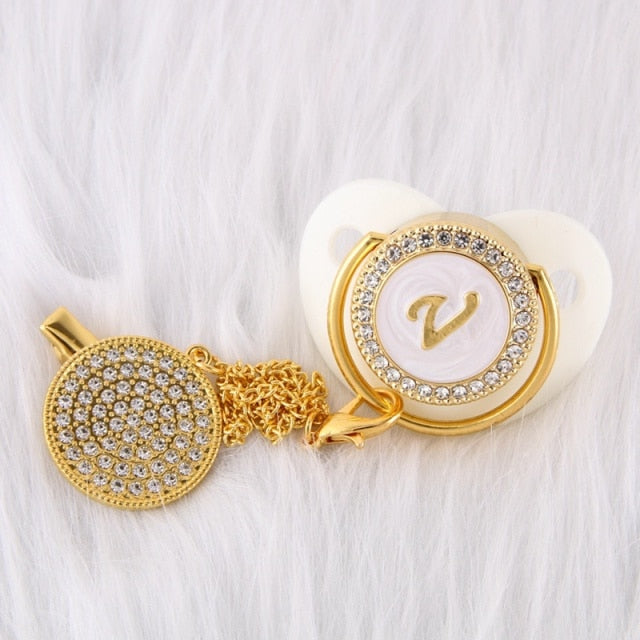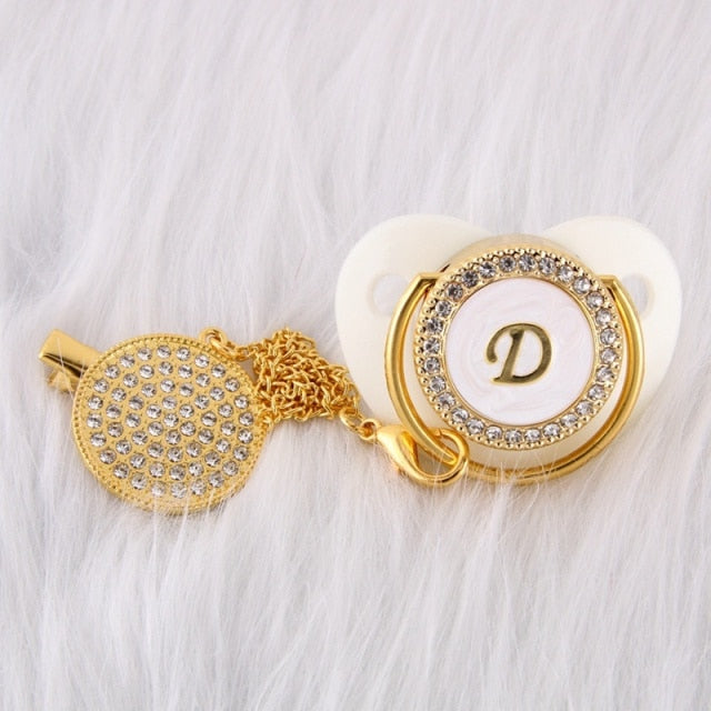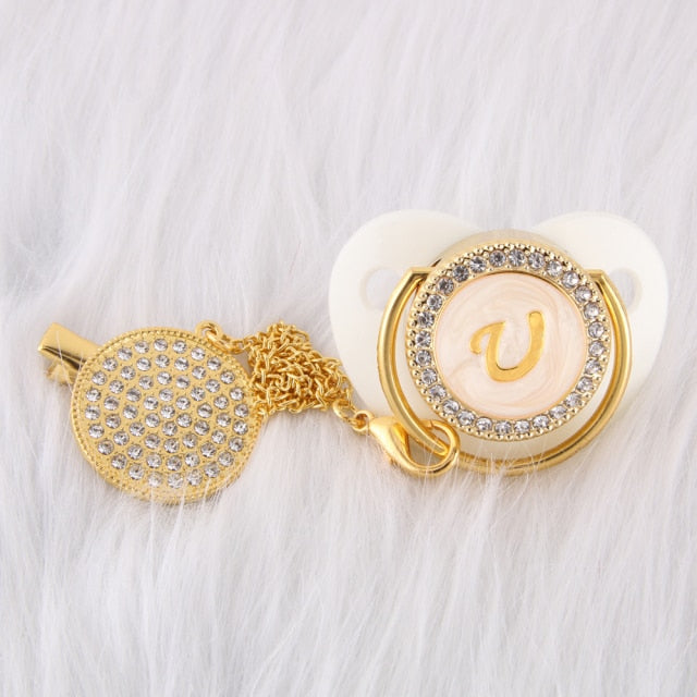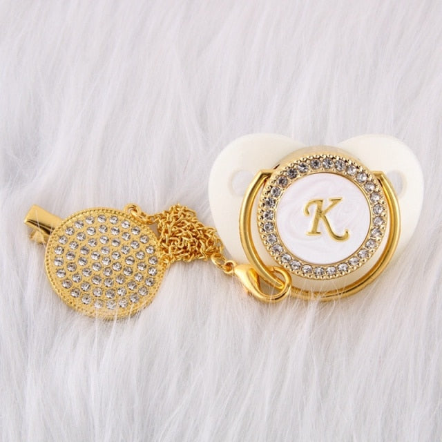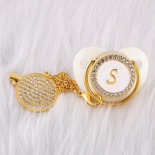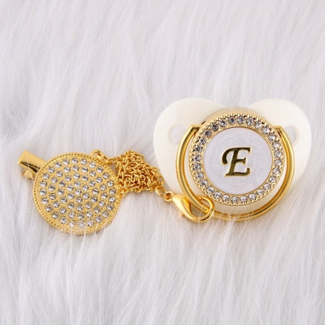 Esta chupeta personalizada com prendedor feito à mão é incrível! Adequado para o pequeno príncipe ou princesa em sua vida. Possui a quantidade clássica de brilho e beleza que o apresentaria como um excelente acessório de bebê. Ótimo para chás de bebê, batizados, revelação de gênero, festas e muito mais!